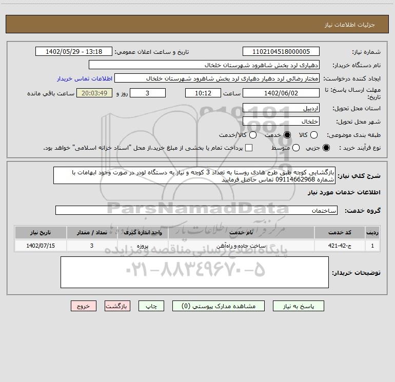 شرح کلی نیاز: بازگشایی کوچه طبق طرح هادی روستا به تعداد 3 کوچه و نیاز به دستگاه لودر در صورت وجود ابهامات با شماره 09114662968 تماس حاصل فرمایید