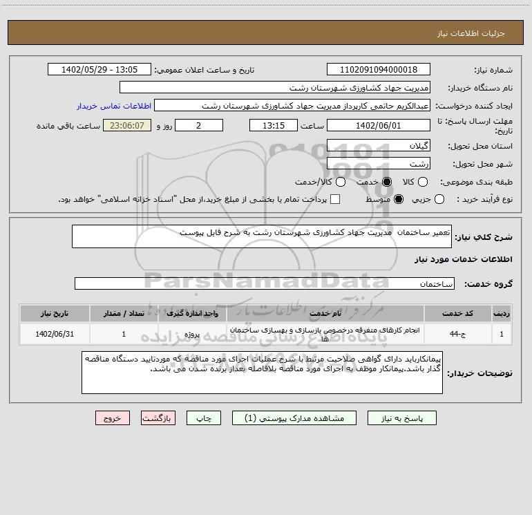 شرح کلی نیاز: تعمیر ساختمان مدیریت جهاد کشاورزی شهرستان رشت به شرح فایل پیوست