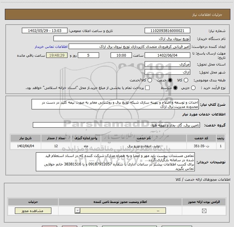 شرح کلی نیاز: احداث و توسعه و اصلاح و بهینه سازی شبکه توزیع برق و روشنایی معابر به صورت نیمه کلید در دست در محدوده مدیریت برق اراک