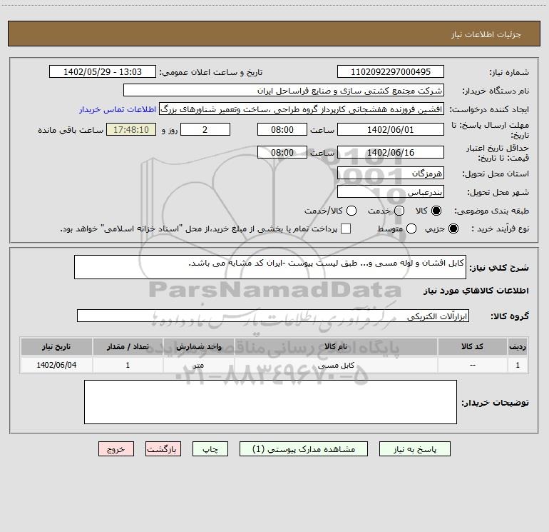 شرح کلی نیاز: کابل افشان و لوله مسی و... طبق لیست پیوست -ایران کد مشابه می باشد.