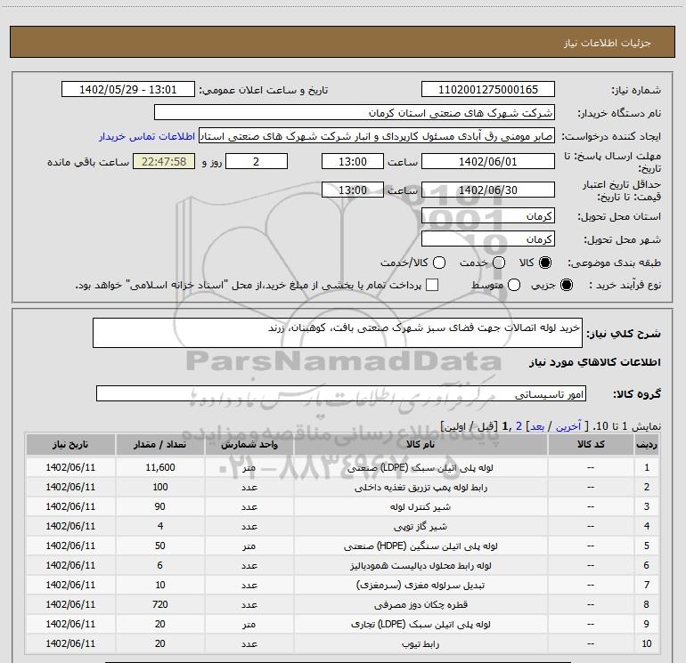 شرح کلی نیاز: خرید لوله اتصالات جهت فضای سبز شهرک صنعتی بافت، کوهبنان، زرند