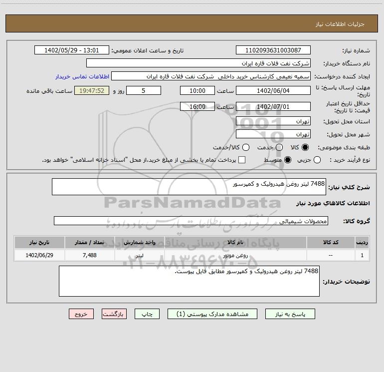 شرح کلی نیاز: 7488 لیتر روغن هیدرولیک و کمپرسور