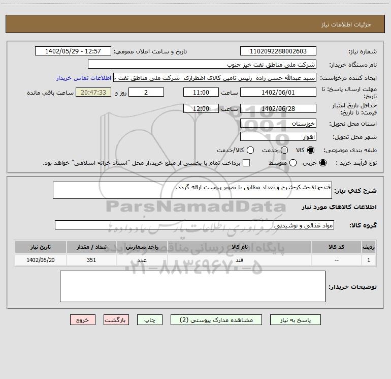 شرح کلی نیاز: قند-چای-شکر-شرح و تعداد مطابق با تصویر پیوست ارائه گردد.