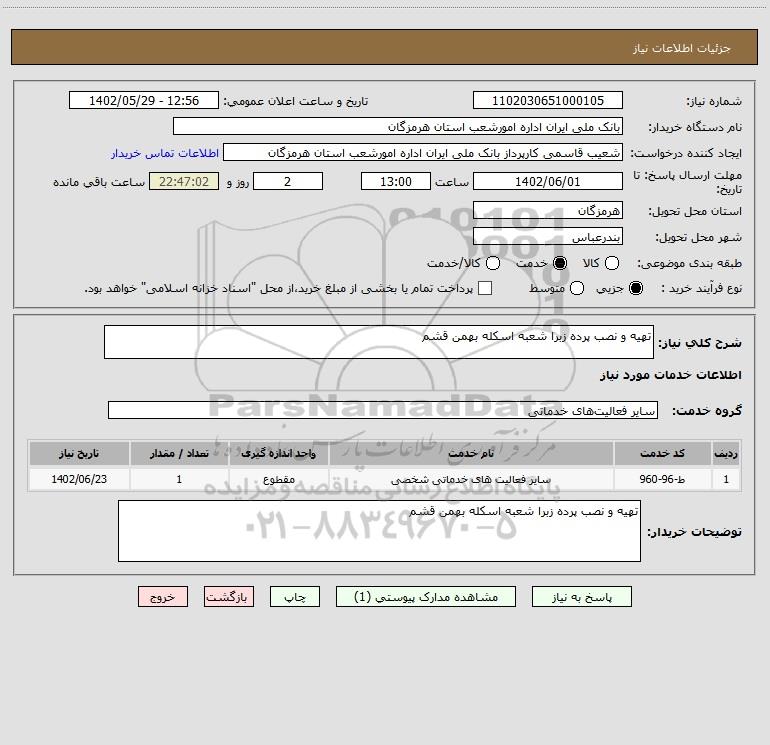 شرح کلی نیاز: تهیه و نصب پرده زبرا شعبه اسکله بهمن قشم