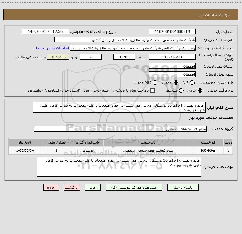 شرح کلی نیاز: خرید و نصب و اجرای 16 دستگاه دوربین مدار بسته در حوزه اصفهان با کلیه تجهیزات به صورت کامل- طبق شرایط پیوست