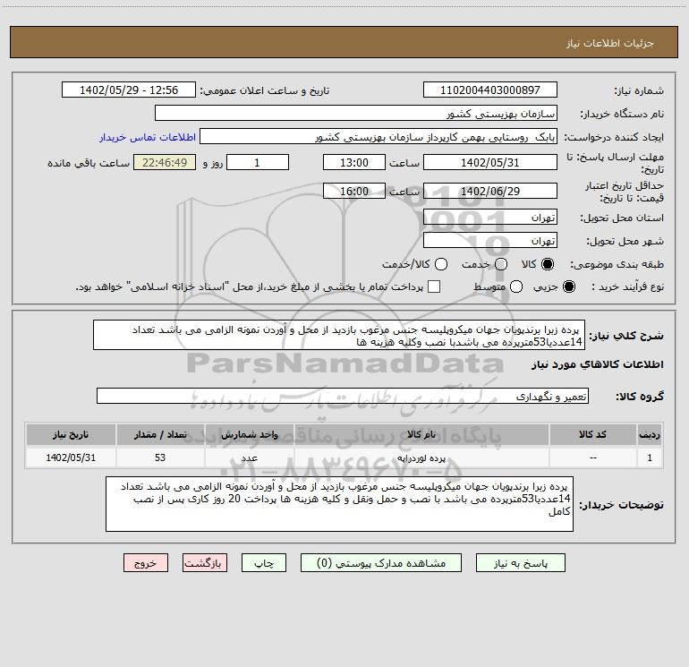 شرح کلی نیاز: پرده زبرا برندپویان جهان میکروپلیسه جنس مرغوب بازدید از محل و آوردن نمونه الزامی می باشد تعداد 14عددیا53مترپرده می باشدبا نصب وکلیه هزینه ها