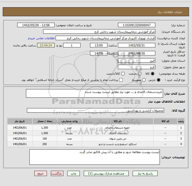 | 2 | -- | دستمال کاغذی | بسته | 1,500 | 1402/06/01 |