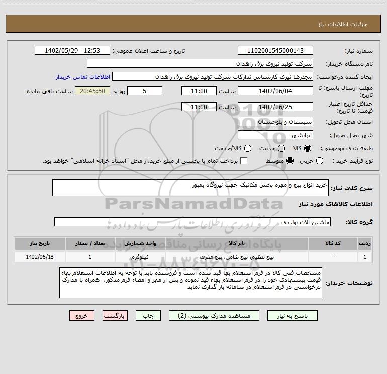 نام دستگاه خریدار:شرکت تولید نیروی برق زاهدان