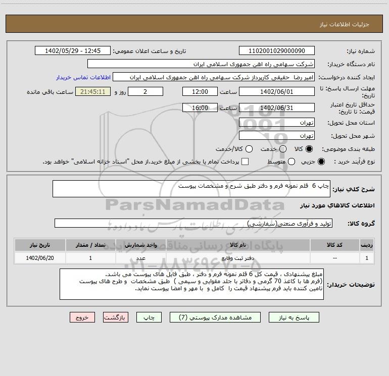 شرح کلی نیاز: چاپ 6 قلم نمونه فرم و دفتر طبق شرح و مشخصات پیوست