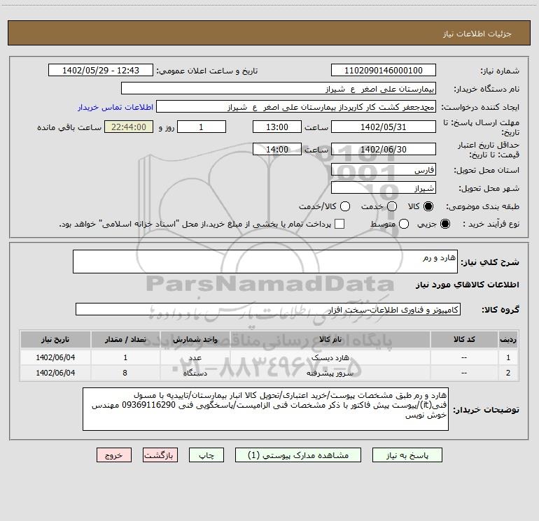 توضیحات خریدار:هارد و رم طبق مشخصات پیوست/خرید اعتباری/تحویل کالا انبار بیمارستان/تاییدیه با مسول فنی(it)/پیوست پیش فاکتور با ذکر مشخصات فنی الزامیست/پاسخگویی فنی 09369116290 مهندس خوش نویس