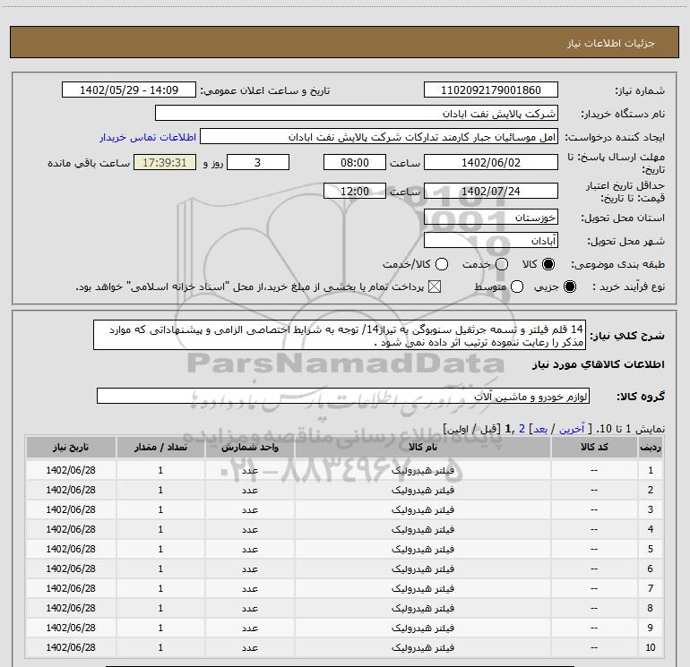 | 9 | -- | فیلتر هیدرولیک | عدد | 1 | 1402/06/28 |