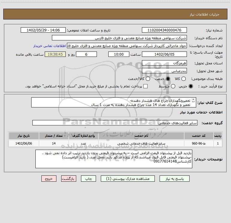 شرح کلی نیاز: تعمیرونگهداری چراغ های هشدار دهنده- تعمیر و نگهداری تعداد 14 عدد چراغ هشدار دهنده به مدت 1 سال