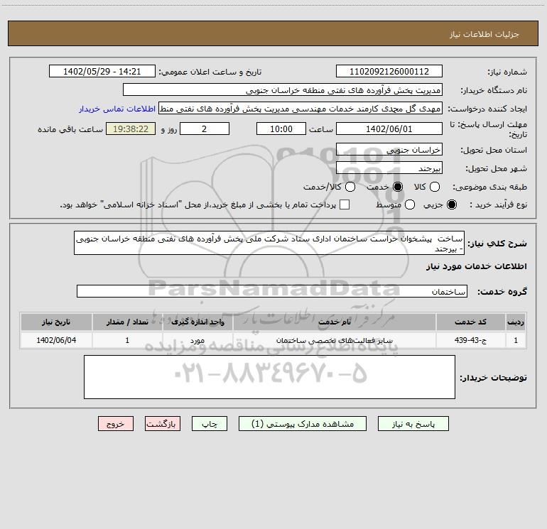 شرح کلی نیاز: ساخت پیشخوان حراست ساختمان اداری ستاد شرکت ملی پخش فرآورده های نفتی منطقه خراسان جنوبی - بیرجند