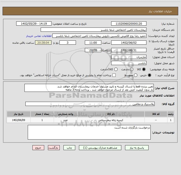 شرح کلی نیاز: تعین برنده فقط با ارسال کیسه و تایید مسئول خدمات بیمارستان انجام خواهد شد
