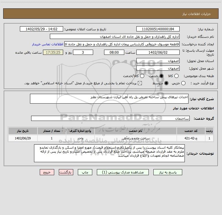 شرح کلی نیاز: احداث تیرهای پیش ساخته تعریض پل راه آهن ابیازن شهرستان نطنز