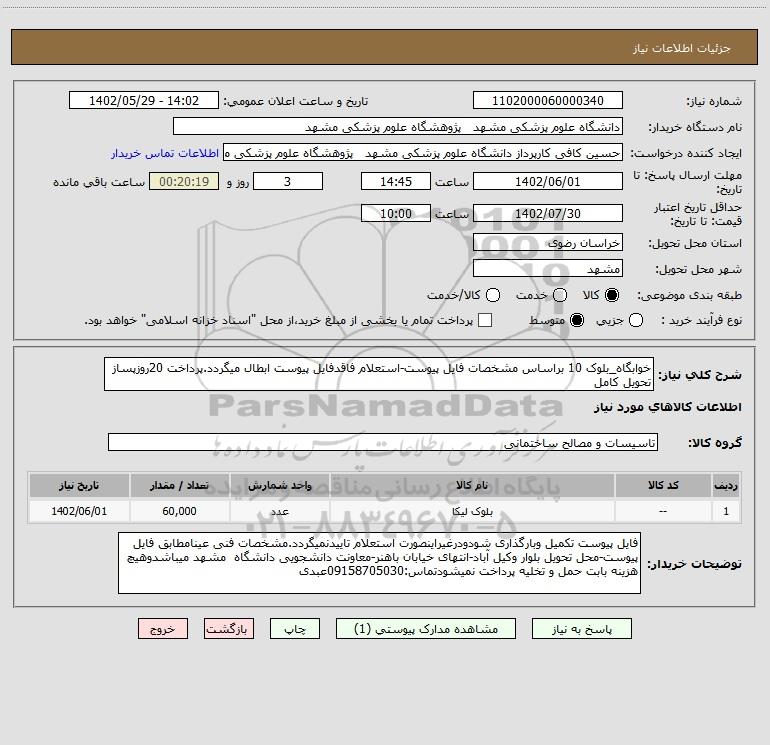شرح کلی نیاز: خوابگاه_بلوک 10 براساس مشخصات فایل پیوست-استعلام فاقدفایل پیوست ابطال میگردد.پرداخت 20روزپساز تحویل کامل