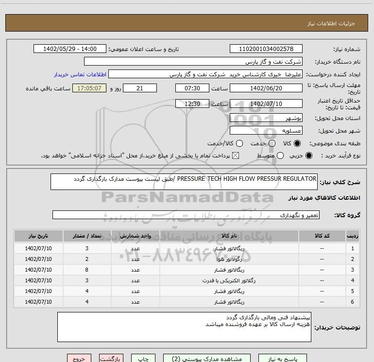 استعلام PRESSURE TECH HIGH FLOW PRESSUR REGULATOR /طبق لیست پیوست مدارک بارگذاری گردد, استعلام PRESSURE TECH HIGH FLOW PRESSUR REGULATOR /طبق لیست پیوست مدارک بارگذاری گردد