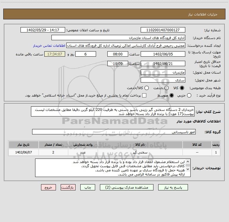 توضیحات خریدار:این استعلام مشمول انعقاد قرار داد بوده و با برنده قرار داد بسته خواهد شد کالای درخواستی باید مطابق مشخصات فنی فایل پیوست تحویل گردد. هزینه حمل تا فرودگاه ساری بر عهده تامین کننده می باشد. ارائه پیش فاکتور در سامانه الزامی می باشد. 01133718800
