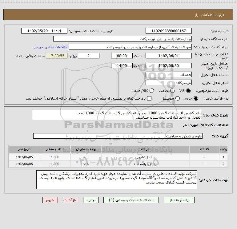 شرح کلی نیاز: باند کشی 10 سانت 5 یارد 1000 عدد و باند کشی 15 سانت 5 یارد 1000 عدد تحویل در واحد تدارکات بیمارستان میباشد.
