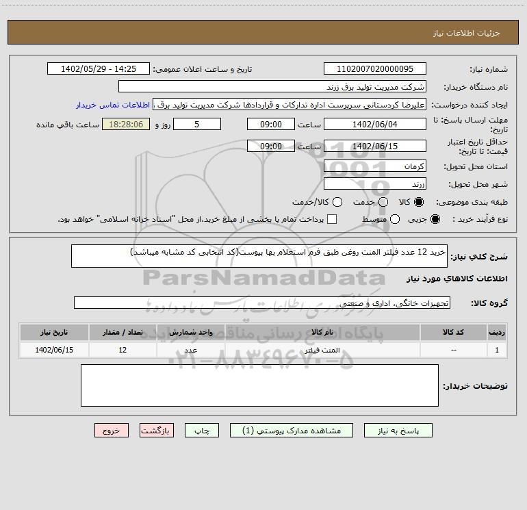 نام دستگاه خریدار:شرکت مدیریت تولید برق زرند