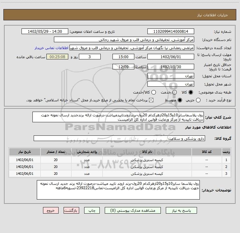 استعلام رول پلاسماسایز10و15و20ازهرکدام 20رول-برندآروندتاییدمیباشد-درصورت ارائه برندجدید ارسال نمونه جهت دریافت تاییدیه از مرکز ورعایت قوانین اداره کل الزامیست, استعلام رول پلاسماسایز10و15و20ازهرکدام 20رول-برندآروندتاییدمیباشد-درصورت ارائه برندجدید ارسال نمونه جهت دریافت تاییدیه از مرکز ورعایت قوانین اداره کل الزامیست