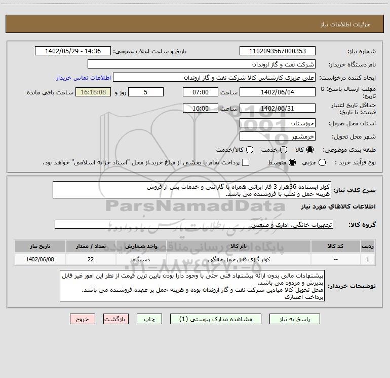 شرح کلی نیاز: کولر ایستاده 36هزار 3 فاز ایرانی همراه با گارانتی و خدمات پس از فروش هزینه حمل و نصب با فروشنده می باشد.