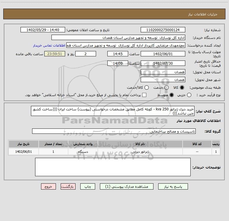شرح کلی نیاز: خرید دیزل ژنراتور 250 kva - کوبله کامل مطابق مشخصات درخواستی (پیوست) ساخت ایران (((ساخت کشور چین نباشد)))