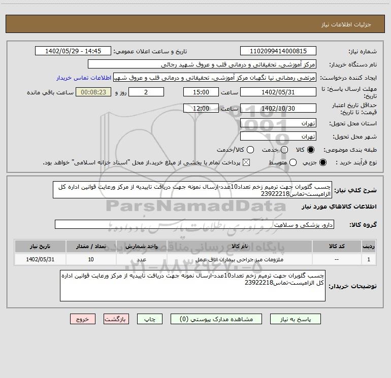شرح کلی نیاز: چسب گلوبران جهت ترمیم زخم تعداد10عدد-ارسال نمونه جهت دریافت تاییدیه از مرکز ورعایت قوانین اداره کل الزامیست-تماس23922218