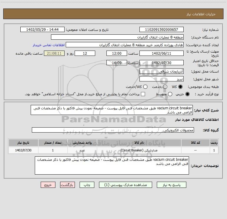 شرح کلی نیاز: vacium circuit breaker طبق مشخصات فنی فایل پیوست - ضمیمه نمودن پیش فاکتور با ذکر مشخصات فنی الزامی می باشد
