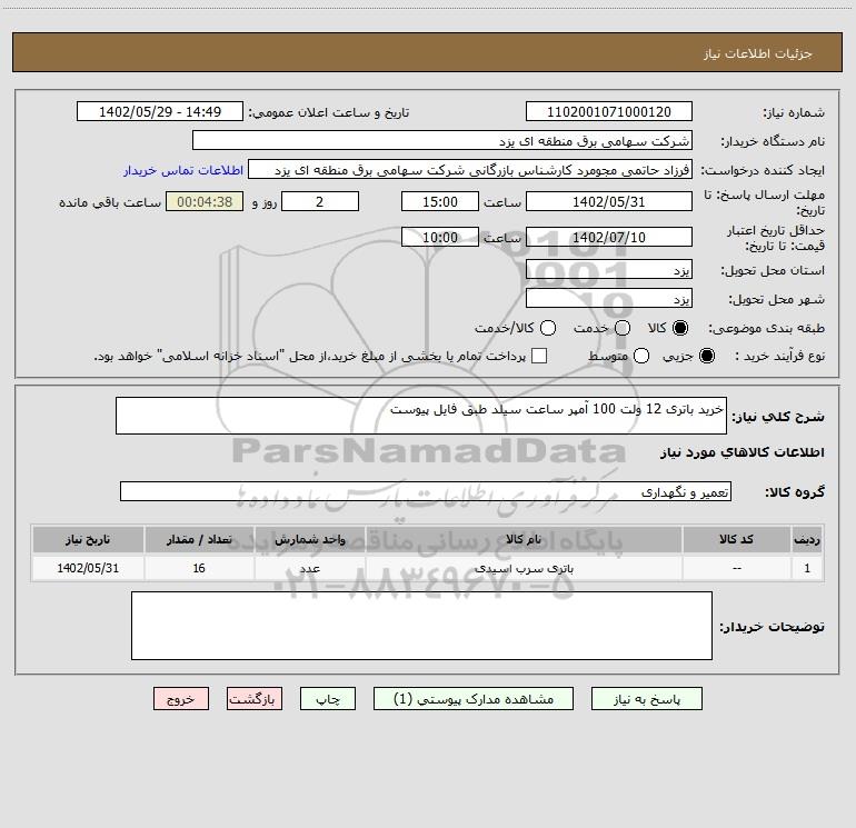 شرح کلی نیاز: خرید باتری 12 ولت 100 آمپر ساعت سیلد طبق فایل پیوست