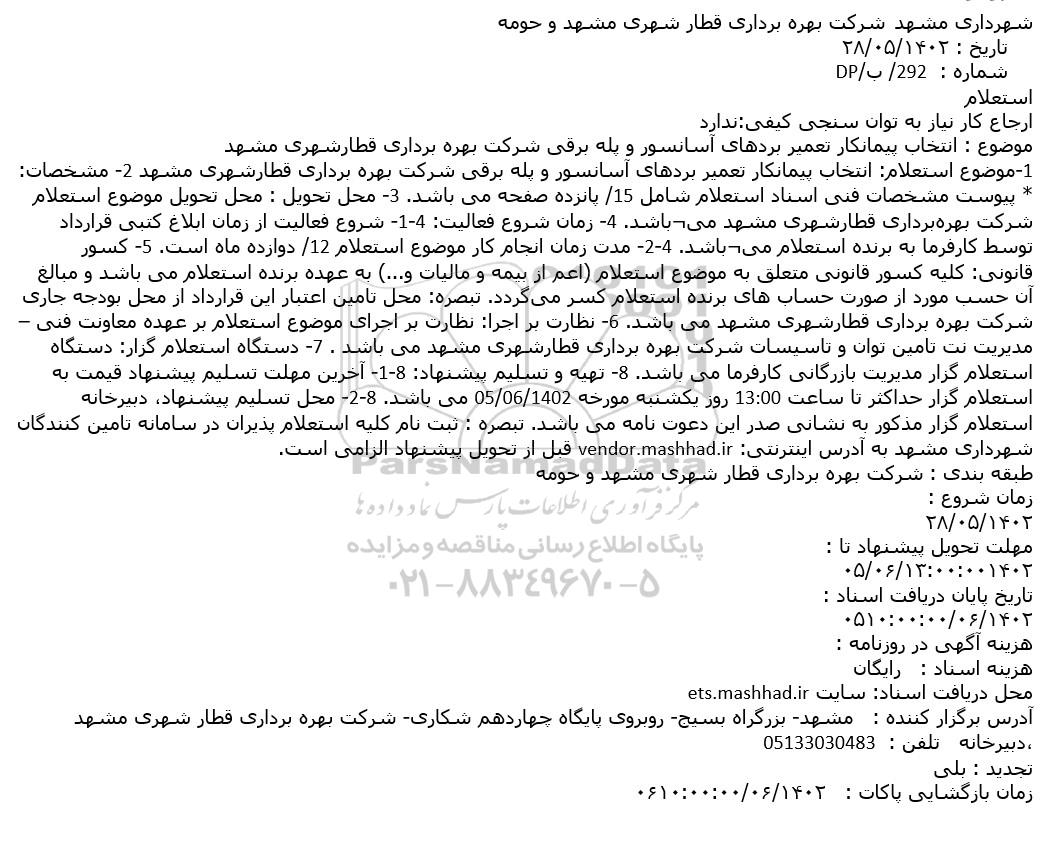 1-موضوع استعلام: انتخاب پیمانکار تعمیر بردهای آسانسور و پله برقی شرکت بهره برداری قطارشهری مشهد 2- مشخصات: * پیوست مشخصات فنی اسناد استعلام شامل 15/ پانزده صفحه می باشد. 3- محل تحویل : محل تحویل موضوع استعلام شرکت بهره‌برداری قطارشهری مشهد می¬باشد. 4- زمان شروع فعالیت: 4-1- شروع فعالیت از زمان ابلاغ کتبی قرارداد توسط کارفرما به برنده استعلام می¬باشد. 4-2- مدت زمان انجام کار موضوع استعلام 12/ دوازده ماه است. 5- کسور قانونی: کلیه کسور قانونی متعلق به موضوع استعلام (اعم از بیمه و مالیات و...) به عهده برنده استعلام می باشد و مبالغ آن حسب مورد از صورت حساب های برنده استعلام کسر می‌‌گردد. تبصره: محل تامین اعتبار این قرارداد از محل بودجه جاری شرکت بهره برداری قطارشهری مشهد می باشد. 6- نظارت بر اجرا: نظارت بر اجرای موضوع استعلام بر عهده معاونت فنی – مدیریت نت تامین توان و تاسیسات شرکت بهره برداری قطارشهری مشهد می باشد . 7- دستگاه استعلام گزار: دستگاه استعلام گزار مدیریت بازرگانی کارفرما می باشد. 8- تهیه و تسلیم پیشنهاد: 8-1- آخرین مهلت تسلیم پیشنهاد قیمت به استعلام گزار حداکثر تا ساعت 13:00 روز یکشنبه مورخه 1402.6.5 می باشد. 8-2- محل تسلیم پیشنهاد، دبیرخانه استعلام گزار مذکور به نشانی صدر این دعوت نامه می باشد. تبصره : ثبت نام کلیه استعلام پذیران در سامانه تامین کنندگان شهرداری مشهد به آدرس اینترنتی: vendor.mashhad.ir قبل از تحویل پیشنهاد الزامی است.