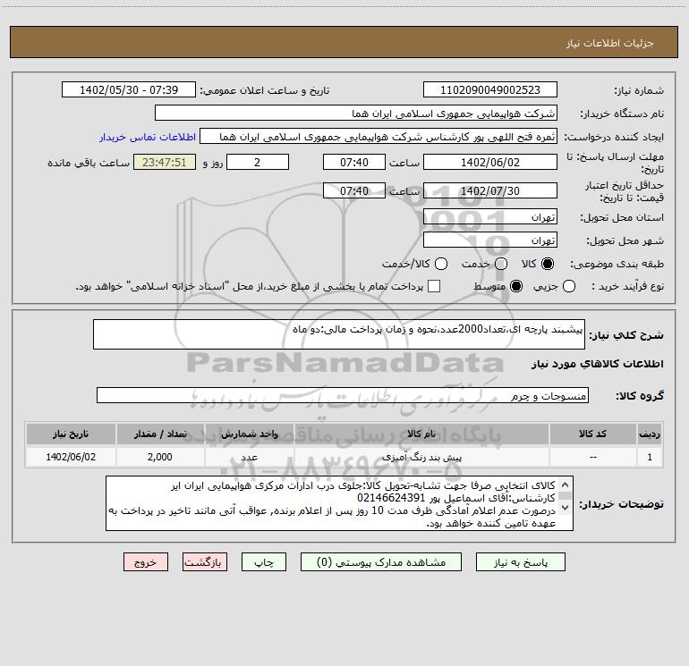 شرح کلی نیاز: پیشبند پارچه ای،تعداد2000عدد،نحوه و زمان پرداخت مالی:دو ماه