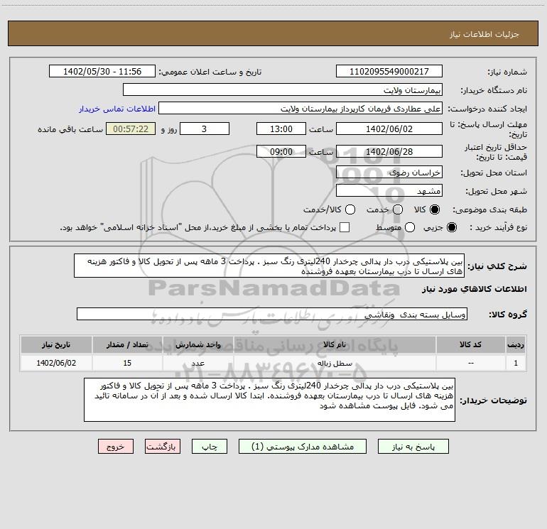 شرح کلی نیاز: بین پلاستیکی درب دار پدالی چرخدار 240لیتری رنگ سبز . پرداخت 3 ماهه پس از تحویل کالا و فاکتور هزینه های ارسال تا درب بیمارستان بعهده فروشنده