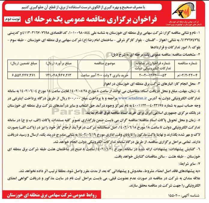 مناقصه خرید باتری 2 ولت 200 آمپر ساعت - نوبت دوم, مناقصه خرید باتری 2 ولت 200 آمپر ساعت - نوبت دوم