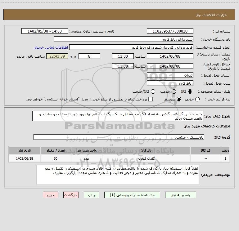 شرح کلی نیاز: خرید باکس گل فایبر گلاس به تعداد 50 عدد مطابق با یک برگ استعلام بهاء پیوستی تا سقف دو میلیارد و پانصد میلیون ریال.