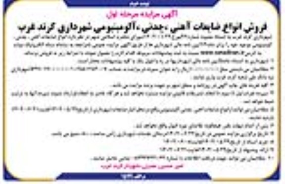 شهرداری کرند غرب در نظر دارد به استناد مصوبه شماره 46 مورخ 1402.1.22 شورای محترم اسلامی شهر در نظر دارد انواع ضایعات آهنی، چدنی، آلومینیومی موجود خود را برابر ماده 13 آیین نامه مالی شهرداری ها از طریق آگهی مزایده عمومی با مراجعه به سامانه ستاد الکترونیک دولت به آدرس سایت ستاد ایران نسبت به ثبت پیشنهادات مربوطه اقدام لازم را معمول نموده، با شرایط زیر به فروش برساند
