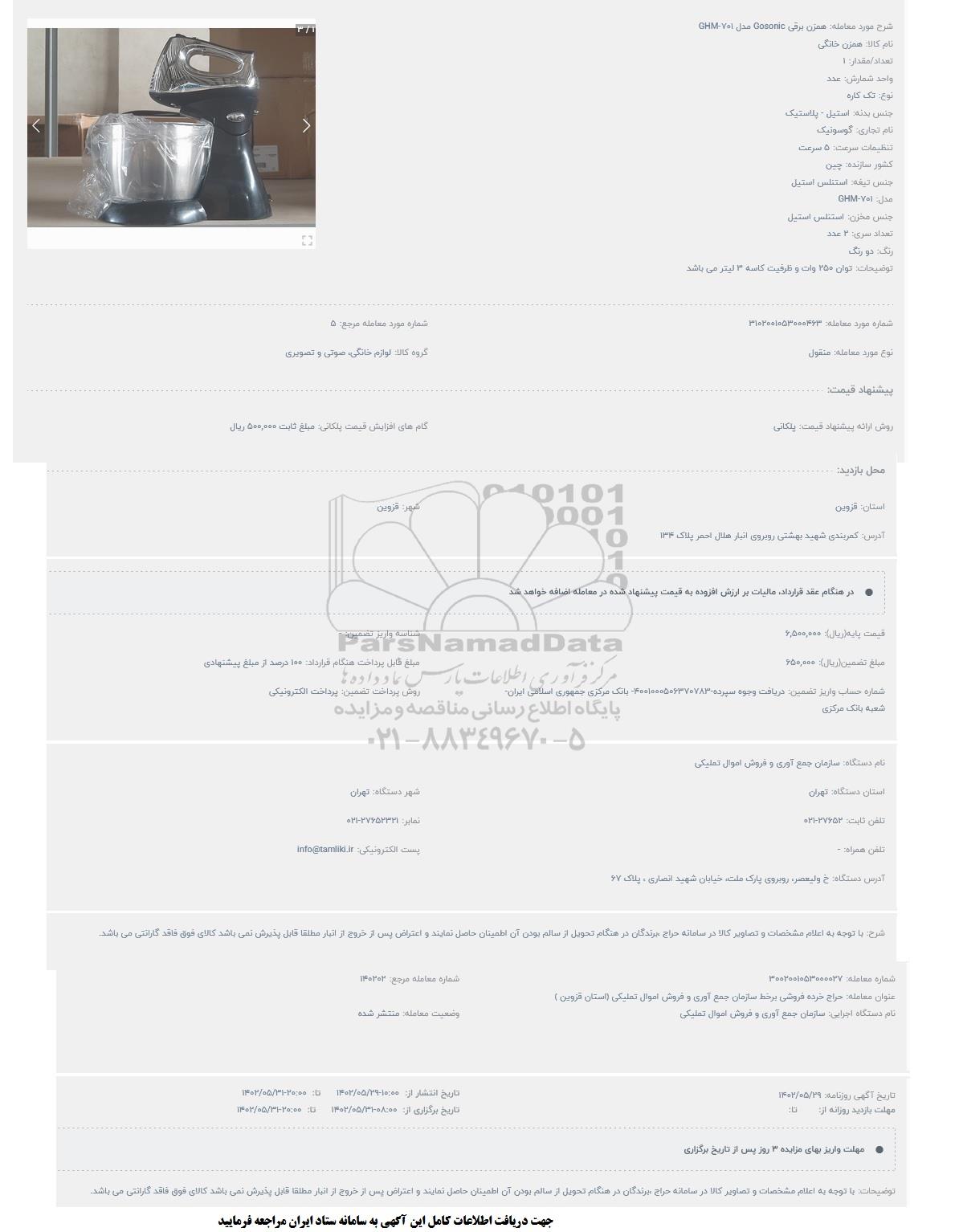 مزایده عمومی حراج همزن برقی Gosonic مدل GHM-701 برگزار میگردد. از کلیه افراد متخصص و شرکتهای واجد شرایط دعوت به عمل میآید تا در این مزایده با کد خبرگزاری پارس نماد : 6251864 شرکت نمایند تاریخ شروع مزایده : 1402/05/30 مهلت شرکت در مزایده: تا پایان روز 1402/05/31 مکان برگزاری اموال واگذاری استانهای قزوین و دستهبندیهای مربوط به این حراجی متفرقه میباشد.