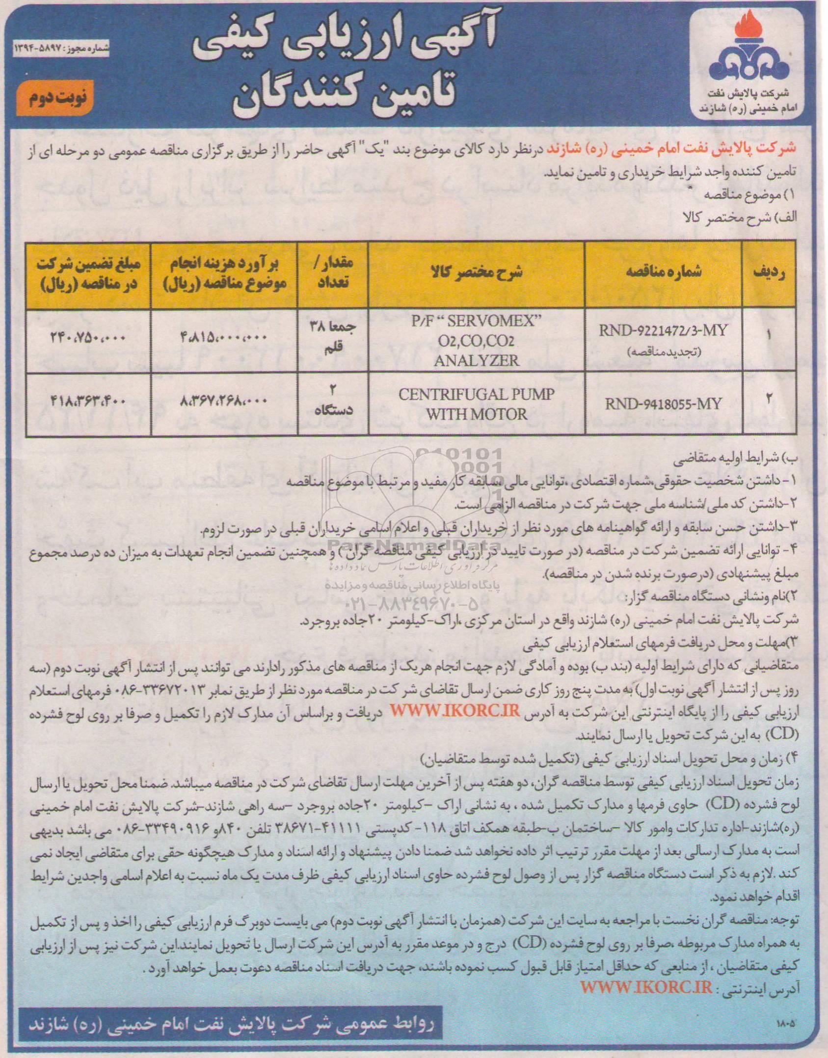 متقاضیانی که دارای شرایط اولیه بند ب بوده و آمادگی لازم جهت انجام هر یک از مناقصه های مذکور را دارند می توانند پس از انتشار اگهی نوبت دوم (سه روز پس از انتشار آگهی نوبت اول) به مدت پنج روز کاری ضمن ارسال تقاضای شرکت در مناقصه مورد نظر از طریق نمابر 33672013-086 فرمهای استعلام ارزیابی کیفی را از پایگاه اینترنتی این شرکت به آدرس WWW.IKORC.IR دریافت و بر اساس آن مدارک لازمه را تکمیل و صرفا بر روی لوح فشرده CD به این شرکت تحویل یا ارسال نمایند .