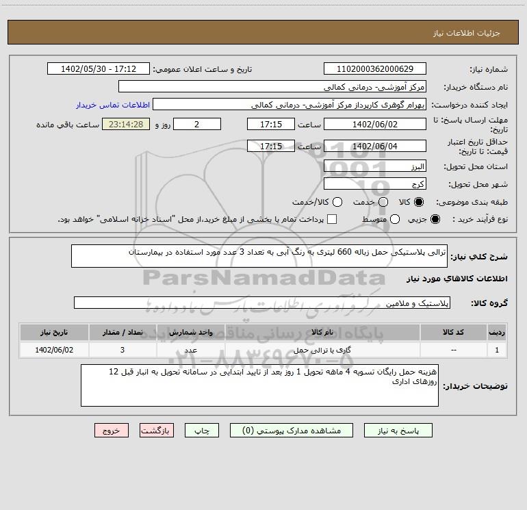 شرح کلی نیاز: ترالی پلاستیکی حمل زباله 660 لیتری به رنگ آبی به تعداد 3 عدد مورد استفاده در بیمارستان
