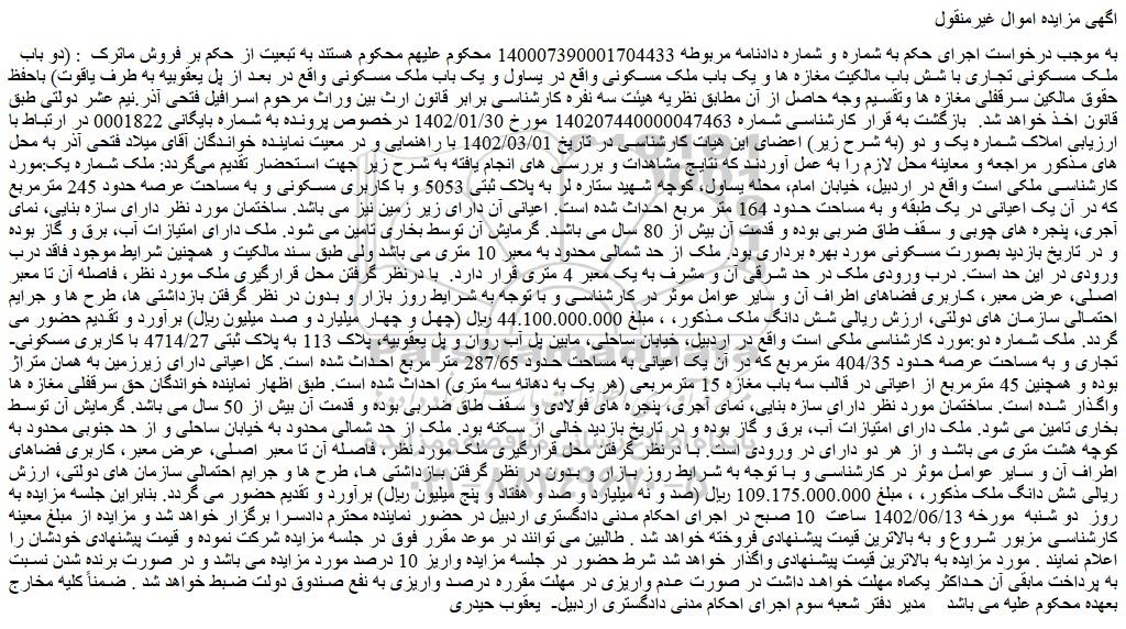 به موجب درخواست اجرای حکم به شماره و شماره دادنامه مربوطه 140007390001704433 محکوم علیهم محکوم هستند به تبعیت از حکم بر فروش ماترک : (دو باب ملک مسکونی تجاری با شش باب مالکیت مغازه ها و یک باب ملک مسکونی واقع در یساول و یک باب ملک مسکونی واقع در بعد از پل یعقوبیه به طرف یاقوت) باحفظ حقوق مالکین سرقفلی مغازه ها وتقسیم وجه حاصل از آن مطابق نظریه هیئت سه نفره کارشناسی برابر قانون ارث بین وراث مرحوم اسرافیل فتحی آذر.نیم عشر دولتی طبق قانون اخذ خواهد شد. بازگشت به قرار کارشناسی شماره 140207440000047463 مورخ 1402/01/30 درخصوص پرونده به شماره بایگانی 0001822 در ارتباط با ارزیابی املاک شماره یک و دو (به شرح زیر) اعضای این هیات کارشناسی در تاریخ 1402/03/01 با راهنمایی و در معیت نماینده خواندگان آقای میلاد فتحی آذر به محل های مذکور مراجعه و معاینه محل لازم را به عمل آوردند که نتایج مشاهدات و بررسی های انجام یافته به شرح زیر جهت استحضار تقدیم میگردد: ملک شماره یک:مورد کارشناسی ملکی است واقع در اردبیل، خیابان امام، محله یساول، کوچه شهید ستاره لر به پلاک ثبتی 5053 و با کاربری مسکونی و به مساحت عرصه حدود 245 مترمربع که در آن یک اعیانی در یک طبقه و به مساحت حدود 164 متر مربع احداث شده است. اعیانی آن دارای زیر زمین نیز می باشد. ساختمان مورد نظر دارای سازه بنایی، نمای آجری، پنجره های چوبی و سقف طاق ضربی بوده و قدمت آن بیش از 80 سال می باشد. گرمایش آن توسط بخاری تامین می شود. ملک دارای امتیازات آب، برق و گاز بوده و در تاریخ بازدید بصورت مسکونی مورد بهره برداری بود. ملک از حد شمالی محدود به معبر 10 متری می باشد ولی طبق سند مالکیت و همچنین شرایط موجود فاقد درب ورودی در این حد است. درب ورودی ملک در حد شرقی آن و مشرف به یک معبر 4 متری قرار دارد. با درنظر گرفتن محل قرارگیری ملک مورد نظر، فاصله آن تا معبر اصلی، عرض معبر، کاربری فضاهای اطراف آن و سایر عوامل موثر در کارشناسی و با توجه به شرایط روز بازار و بدون در نظر گرفتن بازداشتی ها، طرح ها و جرایم احتمالی سازمان های دولتی، ارزش ریالی شش دانگ ملک مذکور، ، مبلغ 44.100.000.000 ریال (چهل و چهار میلیارد و صد میلیون ریال) برآورد و تقدیم حضور می گردد. ملک شماره دو:مورد کارشناسی ملکی است واقع در اردبیل، خیابان ساحلی، مابین پل آب روان و پل یعقوبیه، پلاک 113 به پلاک ثبتی 4714/27 با کاربری مسکونی-تجاری و به مساحت عرصه حدود 404/35 مترمربع که در آن یک اعیانی به مساحت حدود 287/65 متر مربع احداث شده است. کل اعیانی دارای زیرزمین به همان متراژ بوده و همچنین 45 مترمربع از اعیانی در قالب سه باب مغازه 15 مترمربعی (هر یک به دهانه سه متری) احداث شده است. طبق اظهار نماینده خواندگان حق سرقفلی مغازه ها واگذار شده است. ساختمان مورد نظر دارای سازه بنایی، نمای آجری، پنجره های فولادی و سقف طاق ضربی بوده و قدمت آن بیش از 50 سال می باشد. گرمایش آن توسط بخاری تامین می شود. ملک دارای امتیازات آب، برق و گاز بوده و در تاریخ بازدید خالی از سکنه بود. ملک از حد شمالی محدود به خیابان ساحلی و از حد جنوبی محدود به کوچه هشت متری می باشد و از هر دو دارای در ورودی است. با درنظر گرفتن محل قرارگیری ملک مورد نظر، فاصله آن تا معبر اصلی، عرض معبر، کاربری فضاهای اطراف آن و سایر عوامل موثر در کارشناسی و با توجه به شرایط روز بازار و بدون در نظر گرفتن بازداشتی ها، طرح ها و جرایم احتمالی سازمان های دولتی، ارزش ریالی شش دانگ ملک مذکور، ، مبلغ 109.175.000.000 ریال (صد و نه میلیارد و صد و هفتاد و پنج میلیون ریال) برآورد و تقدیم حضور می گردد. بنابراین جلسه مزایده به روز دو شنبه مورخه 1402/06/13 ساعت 10 صبح در اجرای احکام مدنی دادگستری اردبیل در حضور نماینده محترم دادسرا برگزار خواهد شد و مزایده از مبلغ معینه کارشناسی مزبور شروع و به بالاترین قیمت پیشنهادی فروخته خواهد شد . طالبین می توانند در موعد مقرر فوق در جلسه مزایده شرکت نموده و قیمت پیشنهادی خودشان را اعلام نمایند . مورد مزایده به بالاترین قیمت پی