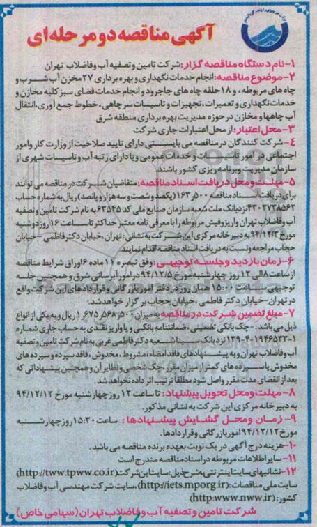 5-مهلت ومحل دریافت اسناد مناقصه : متقاضیان شرکت در مناقصه می توانند برای دریافت اسناد مناقصه مبلغ 163.500(یکصد و شصت و سه هزار و پانصد ) ریال به شماره حساب 4303738562 نزد بانک ملت شعبه سازمان صنایع ملی کد 63545 به نام شرکت تامین و تصفیه آب و فاضلاب تهران واریز و فیش مربوطه را با معرفی نامه معتبر حداکثر تا ساعت 16 روز دوشنبه مورخ94.12.3 به دبیرخانه مرکزی این شرکت به نشانی تهران ـ خیابان دکتر فاطمی ـ خیابان حجاب مراجعه و نسبت به دریافت اسناد مناقصه اقدام نمایند .