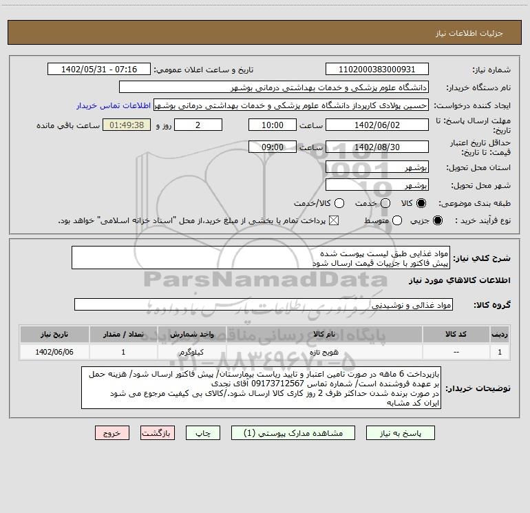 شرح کلی نیاز: مواد غذایی طبق لیست پیوست شده پیش فاکتور با جزییات قیمت ارسال شود