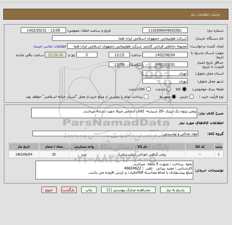 شرح کلی نیاز: روغن زیتون یک لیتری -20 شیشه- کالای انتخابی صرفا جهت تشابه میباشد.