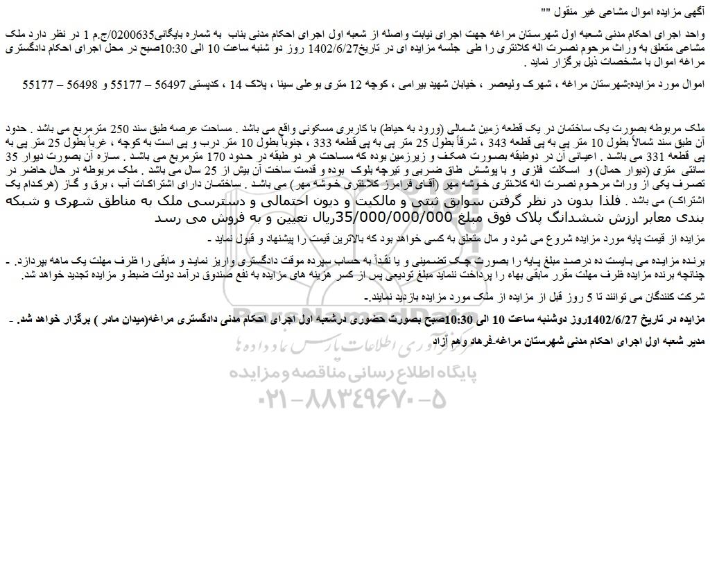 واحد اجرای احکام مدنی شعبه اول شهرستان مراغه جهت اجرای نیابت واصله از شعبه اول اجرای احکام مدنی بناب به شماره بایگانی0200635/ج.م 1 در نظر دارد ملک مشاعی متعلق به وراث مرحوم نصرت اله کلانتری را طی جلسه مزایده ای در تاریخ1402/6/27 روز دو شنبه ساعت 10 الی 10:30صبح در محل اجرای احکام دادگستری مراغه اموال با مشخصات ذیل برگزار نماید .