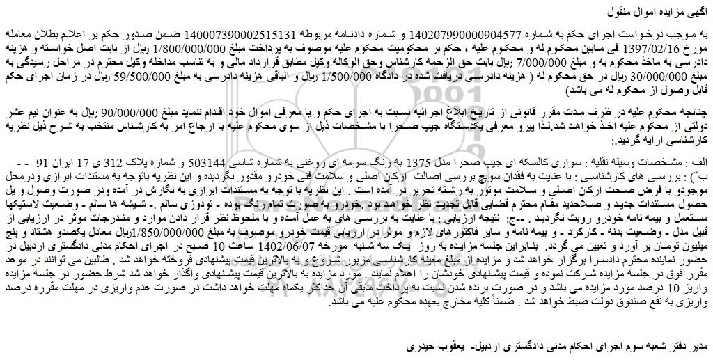 الف : مشخصات وسیله نقلیه : سواری کالسکه ای جیپ صحرا مدل 1375 به رنگ سرمه ای روغنی به شماره شاسی 503144 و شماره پلاک 312 ی 17 ایران 91 - -ب ّ) : بررسی های کارشناسی : با عنایت به فقدان سویچ بررسی اصالت ارکان اصلی و سلامت فنی خودرو مقدور نگردیده و این نظریه باتوجه به مستندات ابرازی ودرمحل موجودو با فرض صحت ارکان اصلی و سلامت موتور به رشته تحریر در آمده است . این نظریه با توجه به مستندات ابرازی به نگارش در آمده ودر صورت وصول و یل حصول مستندات جدید و صلاحدید مقام محترم قضایی قابل تجدید نظر خواهد بود .خودرو به صورت تمام رنگ بوده - تودوزی سالم .- شیشه ها سالم - وضعیت لاستیکها مستعمل و بیمه نامه خودرو رویت نگردید . --ج: نتیجه ارزیابی : با عنایت به بررسی های به عمل آمده و با ملحوظ نظر قرار دادن موارد و مندرجات موثر در ارزیابی از قبیل مدل - وضعیت بدنه - کارکرد - و بیمه نامه و سایر فاکتورهای لازم و موثر در ارزیابی قیمت خودرو موصوف به مبلغ 1/850/000/000ریال معادل یکصدو هشتاد و پنج میلیون تومان بر آورد و تعیین می گردد. بنابراین جلسه مزایده به روز یک سه شنبه مورخه 1402/06/07 ساعت 10 صبح در اجرای احکام مدنی دادگستری اردبیل در حضور نماینده محترم دادسرا برگزار خواهد شد و مزایده از مبلغ معینه کارشناسی مزبور شروع و به بالاترین قیمت پیشنهادی فروخته خواهد شد . طالبین می توانند در موعد مقرر فوق در جلسه مزایده شرکت نموده و قیمت پیشنهادی خودشان را اعلام نمایند . مورد مزایده به بالاترین قیمت پیشنهادی واگذار خواهد شد شرط حضور در جلسه مزایده واریز 10 درصد مورد مزایده می باشد و در صورت برنده شدن نسبت به پرداخت مابقی آن حداکثر یکماه مهلت خواهد داشت در صورت عدم واریزی در مهلت مقرره درصد واریزی به نفع صندوق دولت ضبط خواهد شد . ضمناً کلیه مخارج بعهده محکوم علیه می باشد.