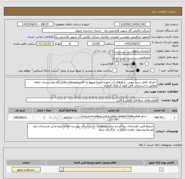 نام دستگاه خریدار:شرکت پالایش گاز شهید هاشمی نژاد استان خراسان رضوی