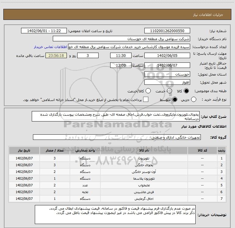شرح کلی نیاز: یخچال.تلویزیون.مایکرووی..تخت خواب.فرش.اجاق صفحه ای- طبق شرح ومشخصات پیوست بارگذاری شده درسامانه