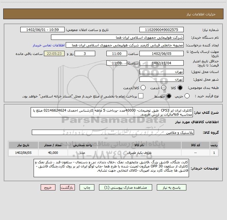 شرح کلی نیاز: کاتلری ایران ایر CP53 طبق توضیحات- 40000عدد -پرداخت 5 ماهه کارشناس احمدی 02146624624 مبلغ با محاسبه 9%مالیات بر ارزش افزوده.