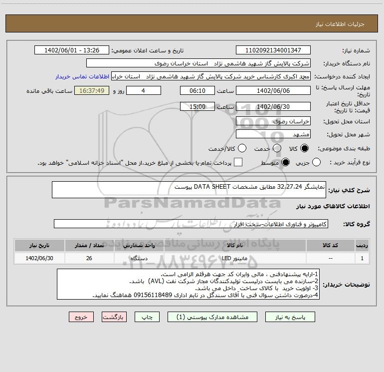 شرح کلی نیاز: نمایشگر 32،27،24 مطابق مشخصات DATA SHEET پیوست