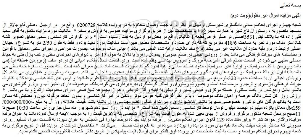 شعبه صادر کننده:شعبه چهارم اجرای احکام مدنی دادگستری شهرستان اردبیل